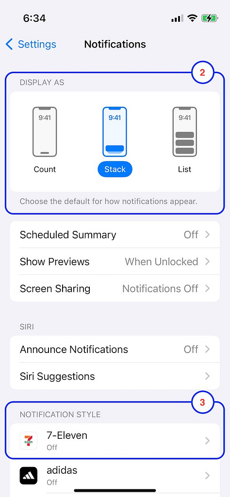 Chọn cách hiển thị noti, gọn gàng nhất là “Stack” (gom nhóm Noti theo app cho đỡ rối), tối giản nhất là “Count” (tắt thông báo nhưng vẫn còn chấm số đỏ).